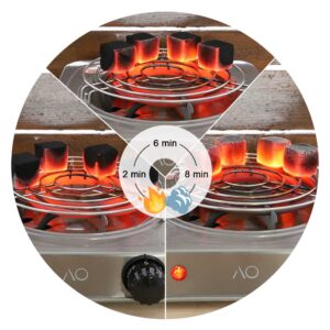 - Če smo nanjo postavili samovnetljivo oglje ga s plošče odmaknemo ko neha prasketati, če pa smo nanjo postavili naravno oglje ga pustimo na plošči tako dolgo, dokler ne postane živo rdeče/oranžne barve (cca. 5 min).
